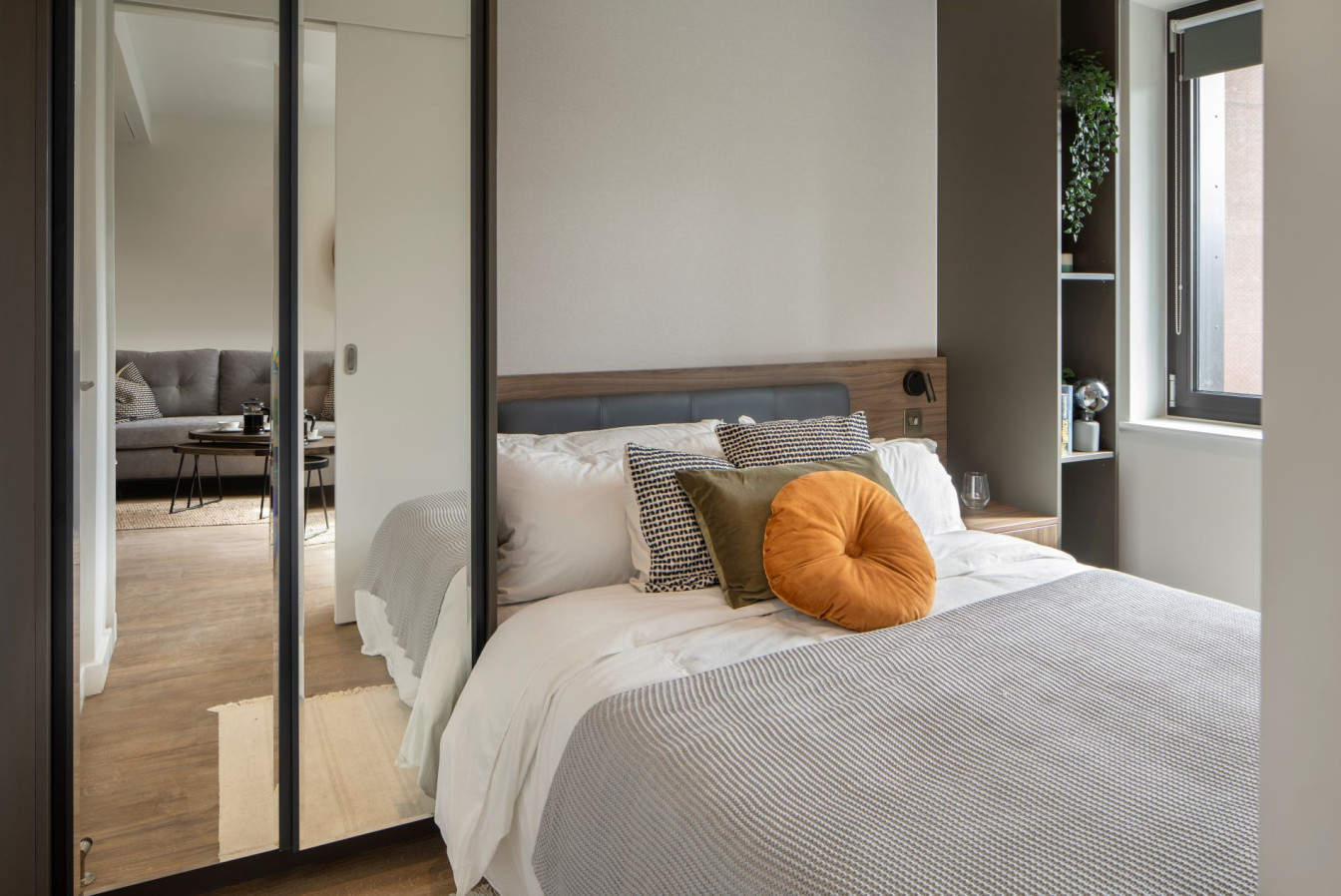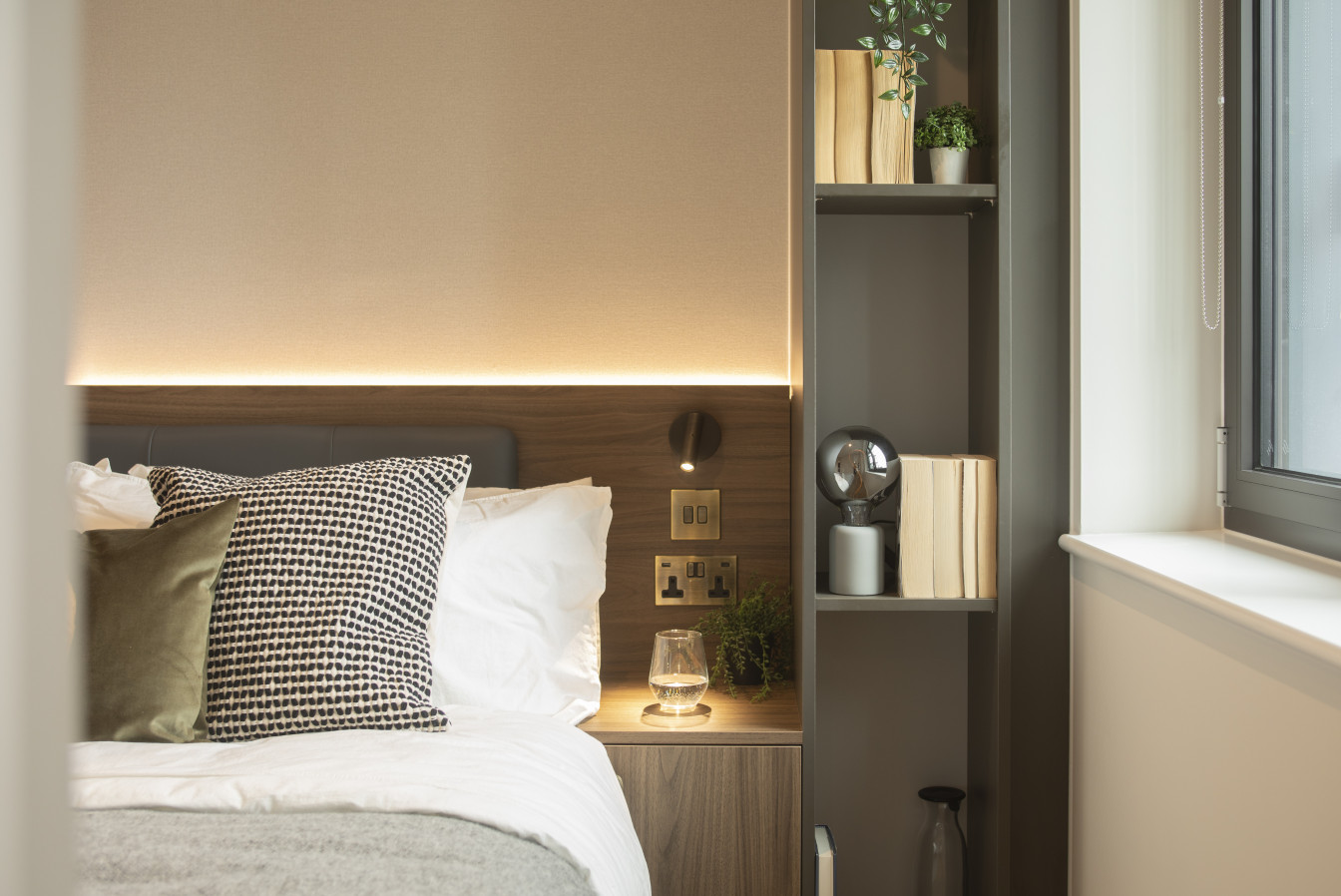 Available in three different colour palettes, our small studio apartments have 1GB WiFi throughout, kitchens with integrated appliances (oven & microwave) and ottoman beds that lift to provide storage underneath. Rental prices differ dependent on location in the building.