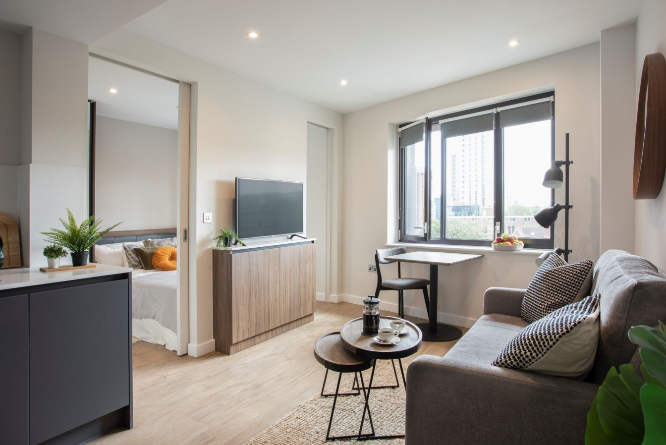 Our 1 bedroom apartments in Croydon come with a compact breakfast bar with two chairs, a sofa, coffee table, under bed storage and double beds. All apartments are tech-enabled for your ease and convenience. Sit back and let us focus on service while you focus on living.