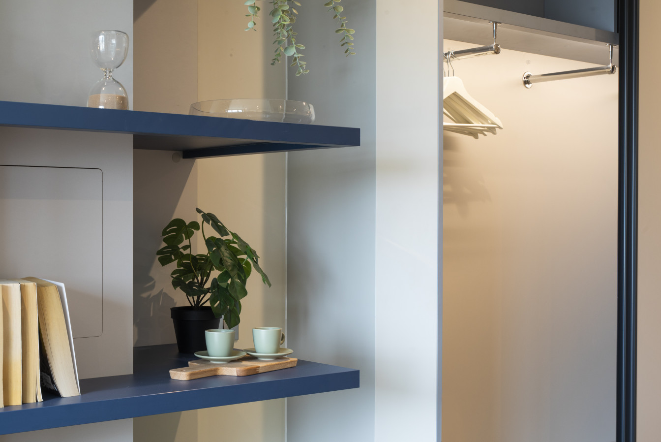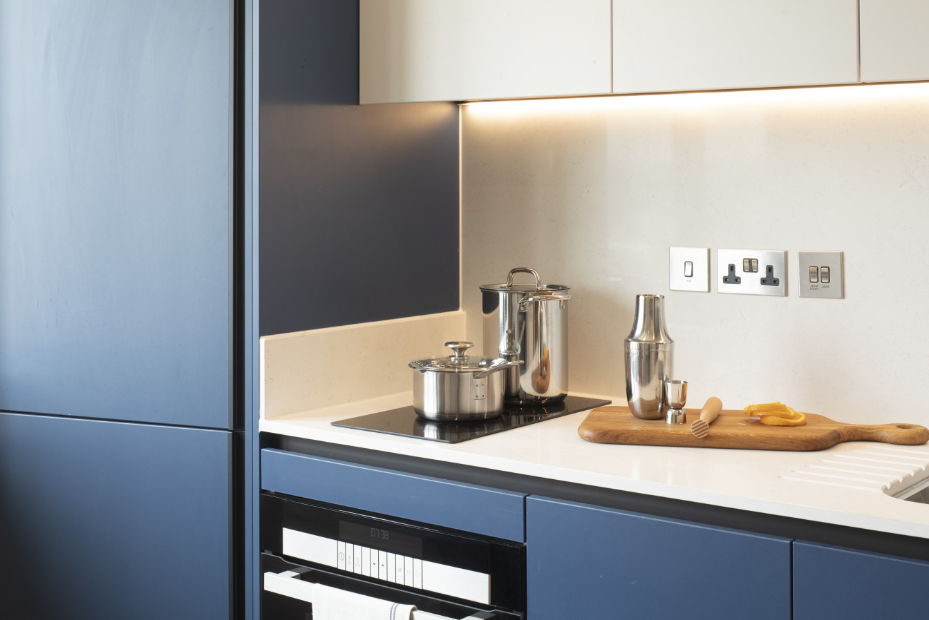 Available in three different colour palettes, our comfy studio apartments have 1GB WiFi throughout, kitchens with integrated appliances (oven & microwave) and ottoman beds that lift to provide storage underneath. Rental prices differ dependent on location in the building.