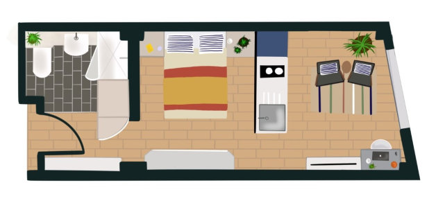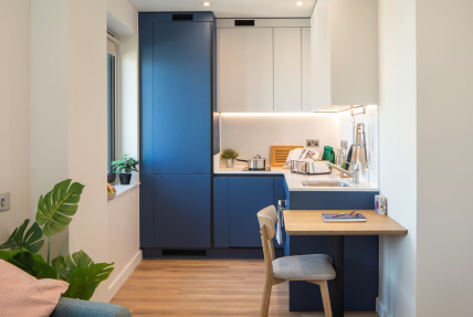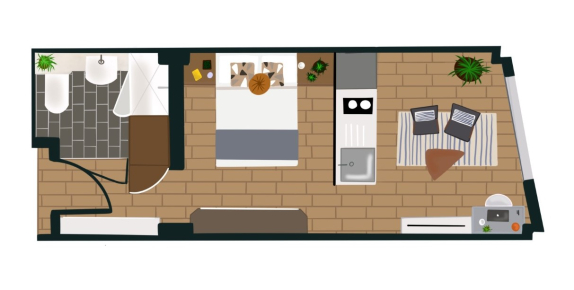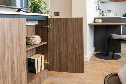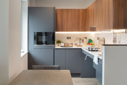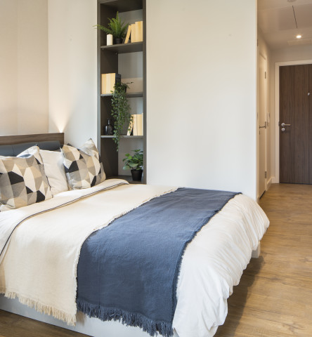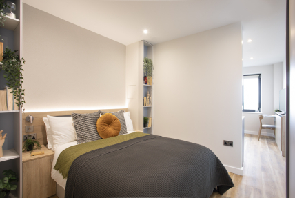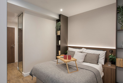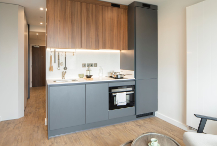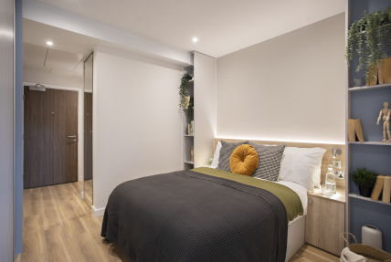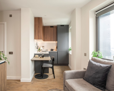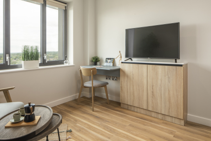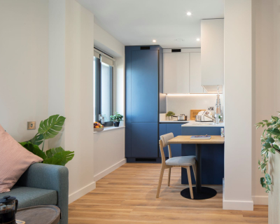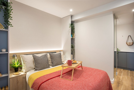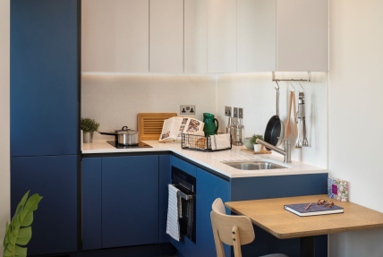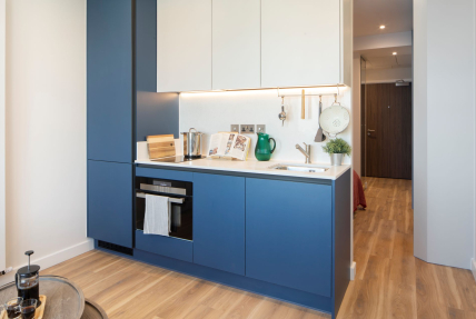 Available in three different colour palettes, our roomy studio apartments have 1GB WiFi throughout, kitchens with integrated appliances (oven & microwave) and ottoman beds that lift to provide storage underneath. Rental prices differ dependent on location in the building.