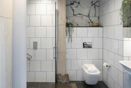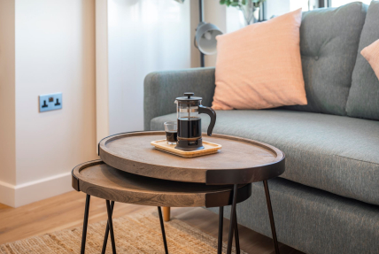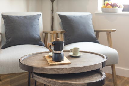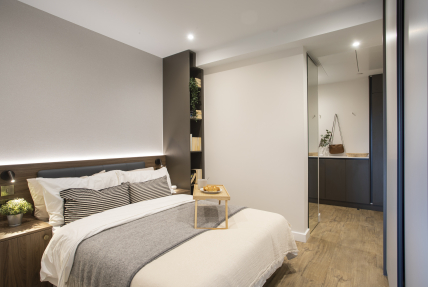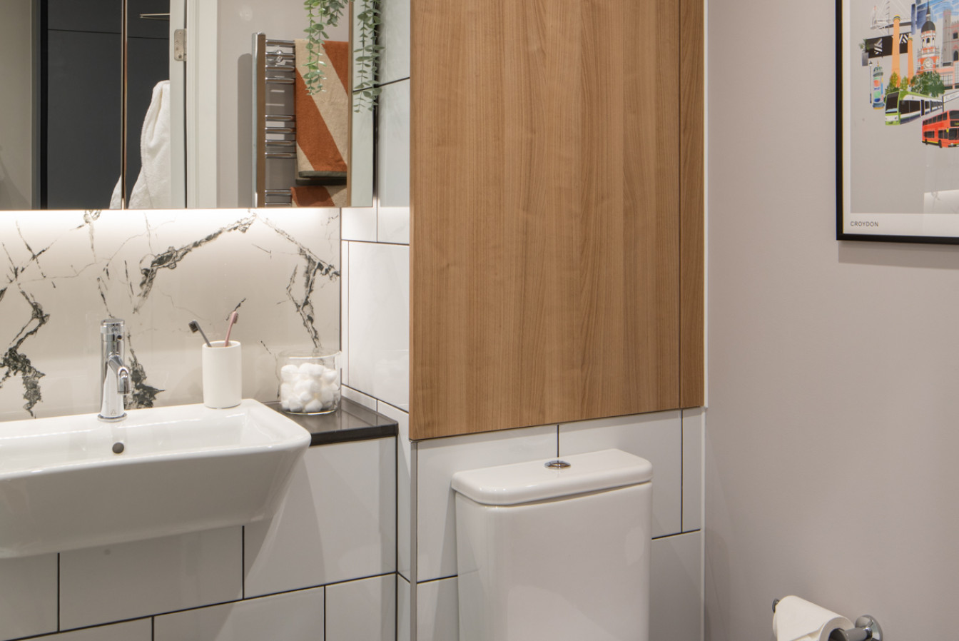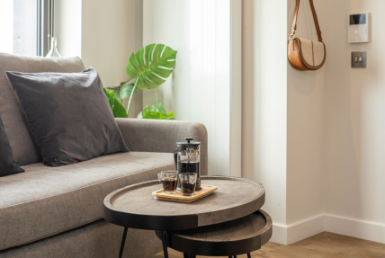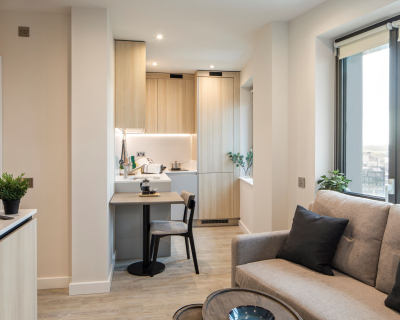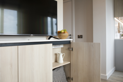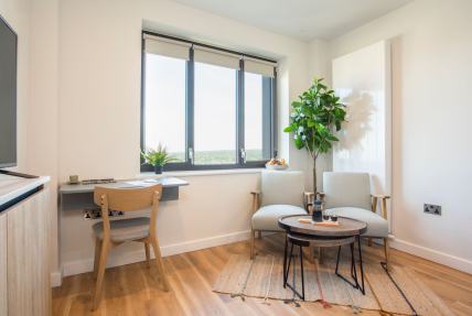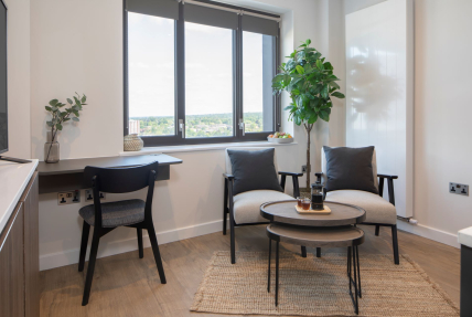 Our roomy furnished studio apartments in Croydon come with either two armchairs or a sofa (depending on floorplan), a desk chair, coffee table, under bed storage and double or king size bed. All apartments are tech-enabled for your ease and convenience and the floorplans with sofas have bathrooms that are adaptable. Sit back and let us focus on service while you focus on living.