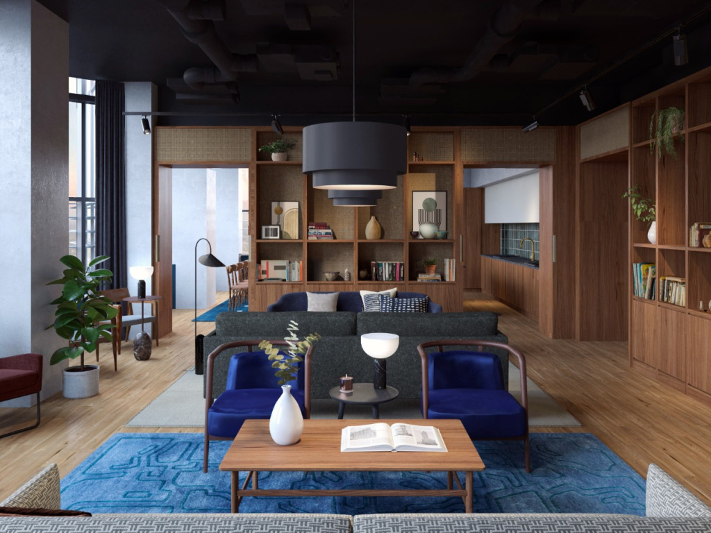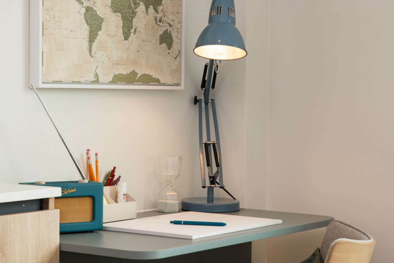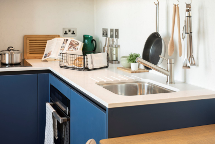 Brilliant, bold, confident. Make a statement - this palette swaps the grey units for blue giving you a stylish kitchen & living area whilst keeping tones muted for sleep.