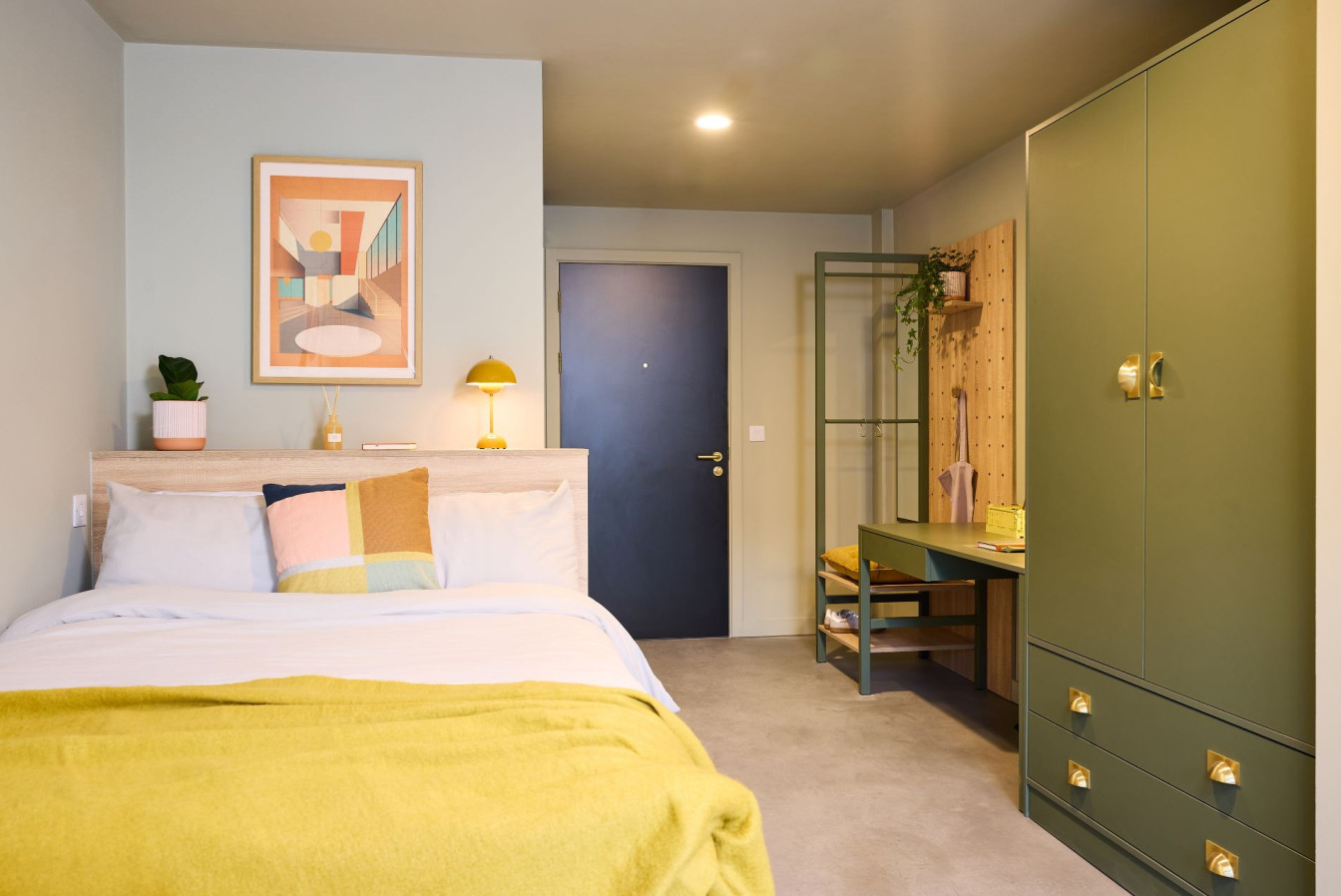 Our Comfy Studios in Leeds are built for comfort and focus. Each has a study area with oversized desk, drawers, pinboard, and ergonomic chair, plus a double bed and a comfy armchair or sofa. You’ll find plenty of storage, a full-height window, and a pegboard to personalise your space — plus a private kitchen and en suite for total independence.