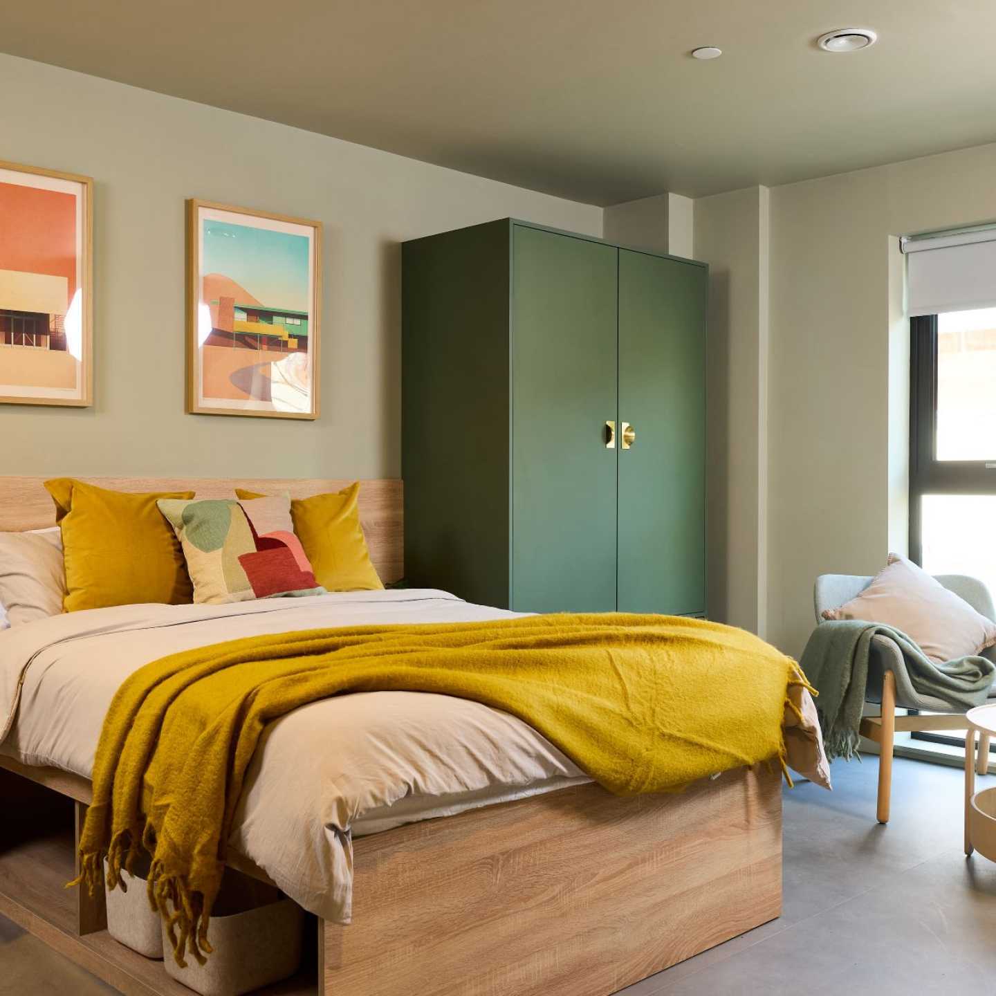 Our Roomy Studios in Leeds are built for comfort and focus. Each has a study area with oversized desk, drawers, pinboard, and ergonomic chair, plus a double bed and a comfy armchair or sofa. You’ll find plenty of storage, a full-height window, and a pegboard to personalise your space — plus a private kitchen and en suite for total independence.